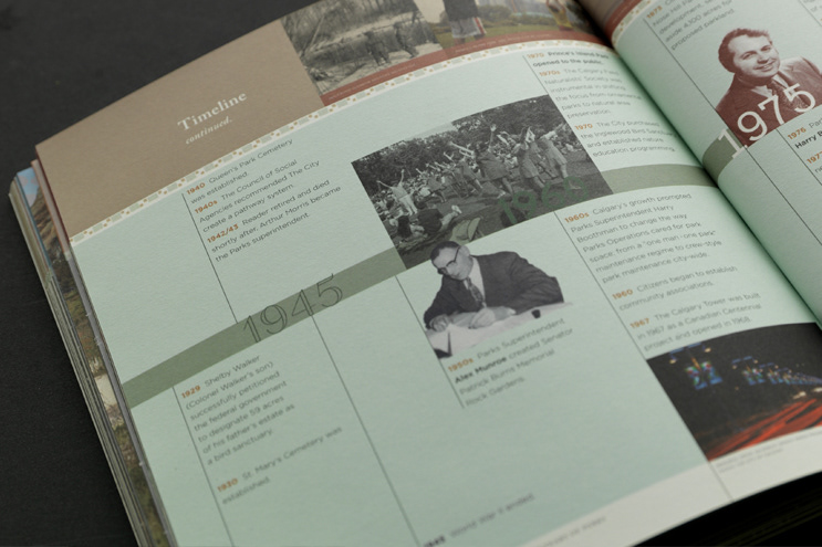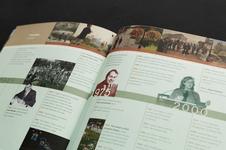 The Parks 100 book celebrates Parks in Calgary from 1875 from the ground up. It was created to celebrate The City of Calgary Parks' 100th year. The book is a timeline of how Parks began and the individuals integral in making Calgary's parks what they are today.